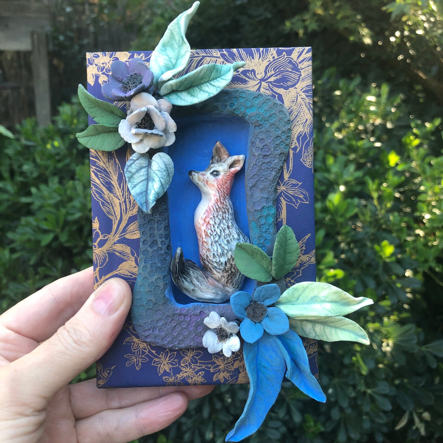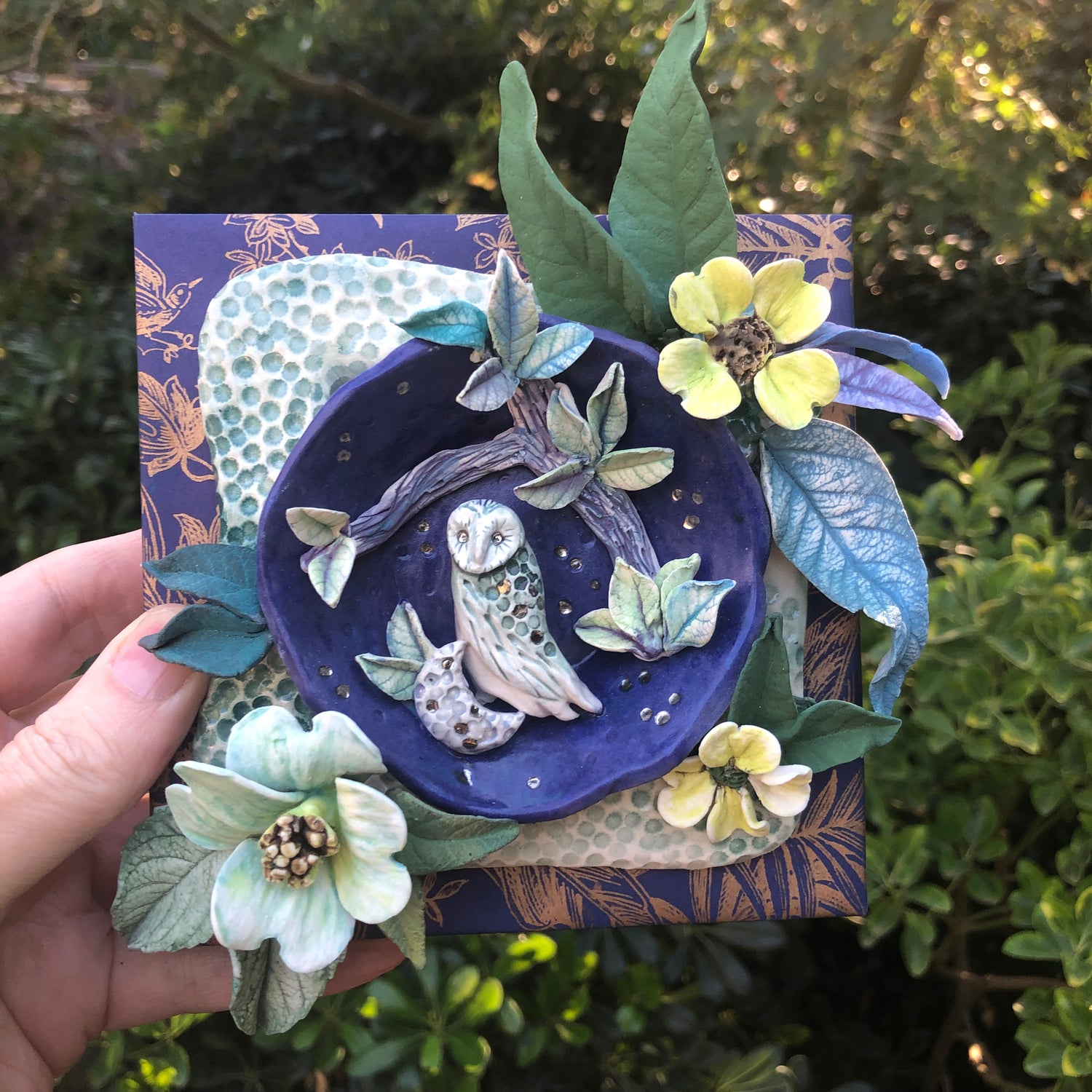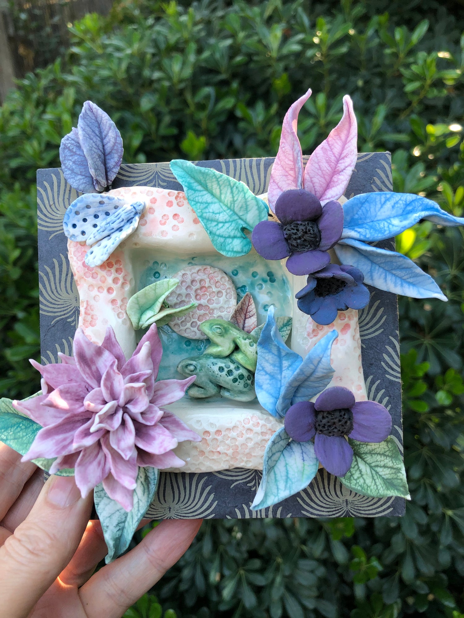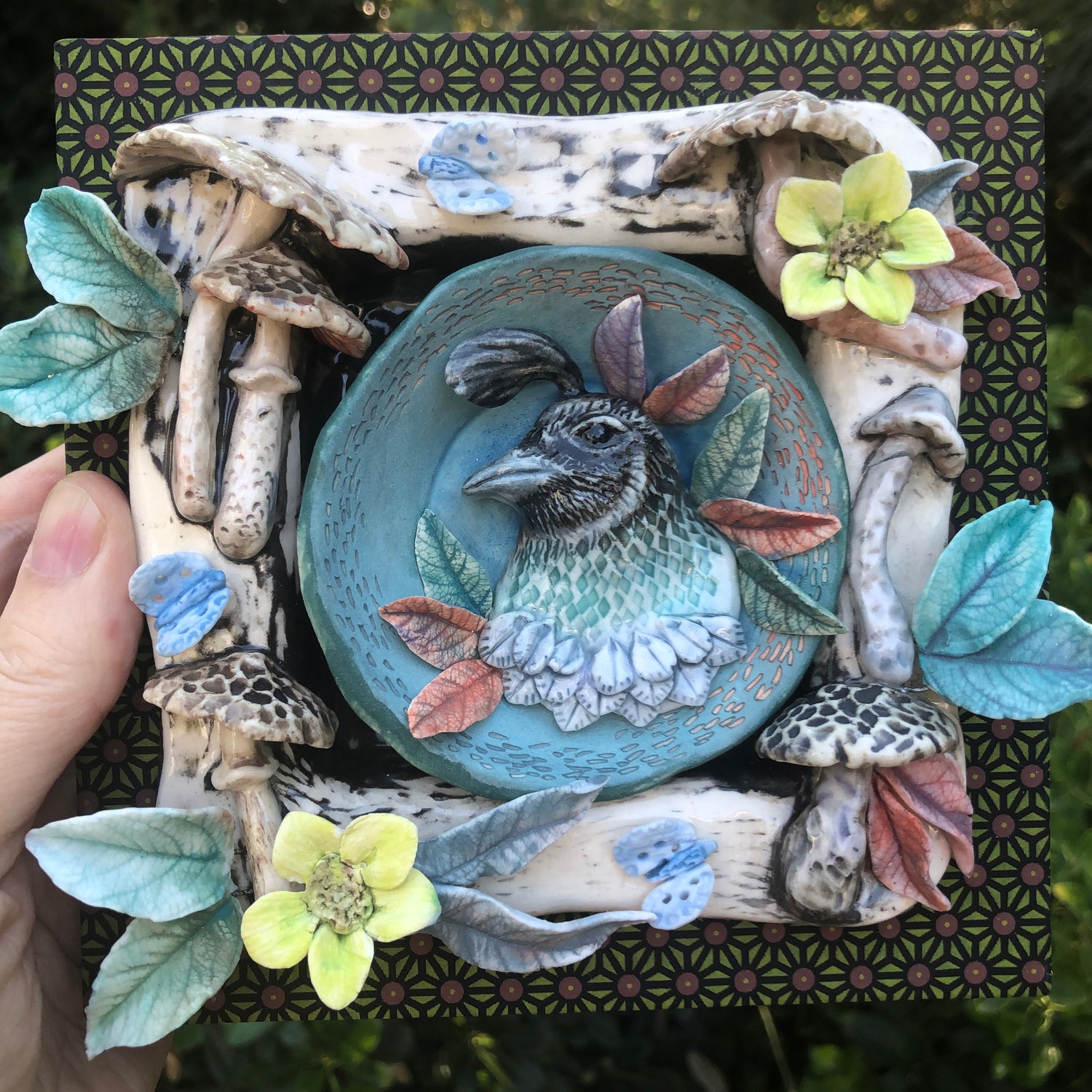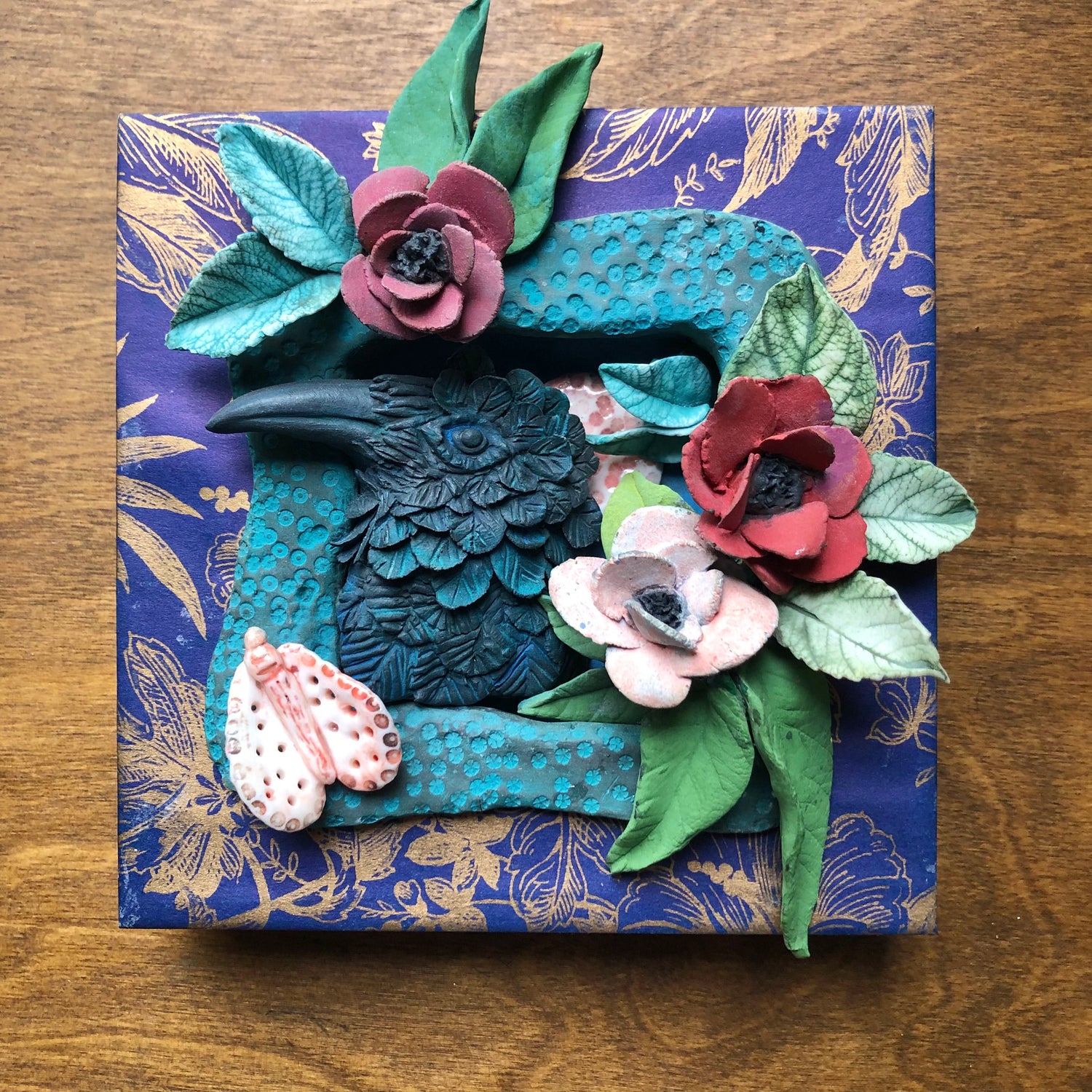 Clay is my new muse, and I am enjoying the process of creating on a three dimensional level, prompted by my favorite flora and fauna. The wall hangings are created from porcelain clay, and painted with velvet underglazes, with touches of gold luster and shiny overglazes finishes. Each one is mounted to paper wrapped wood niche that has hardware for hanging in a special place.
