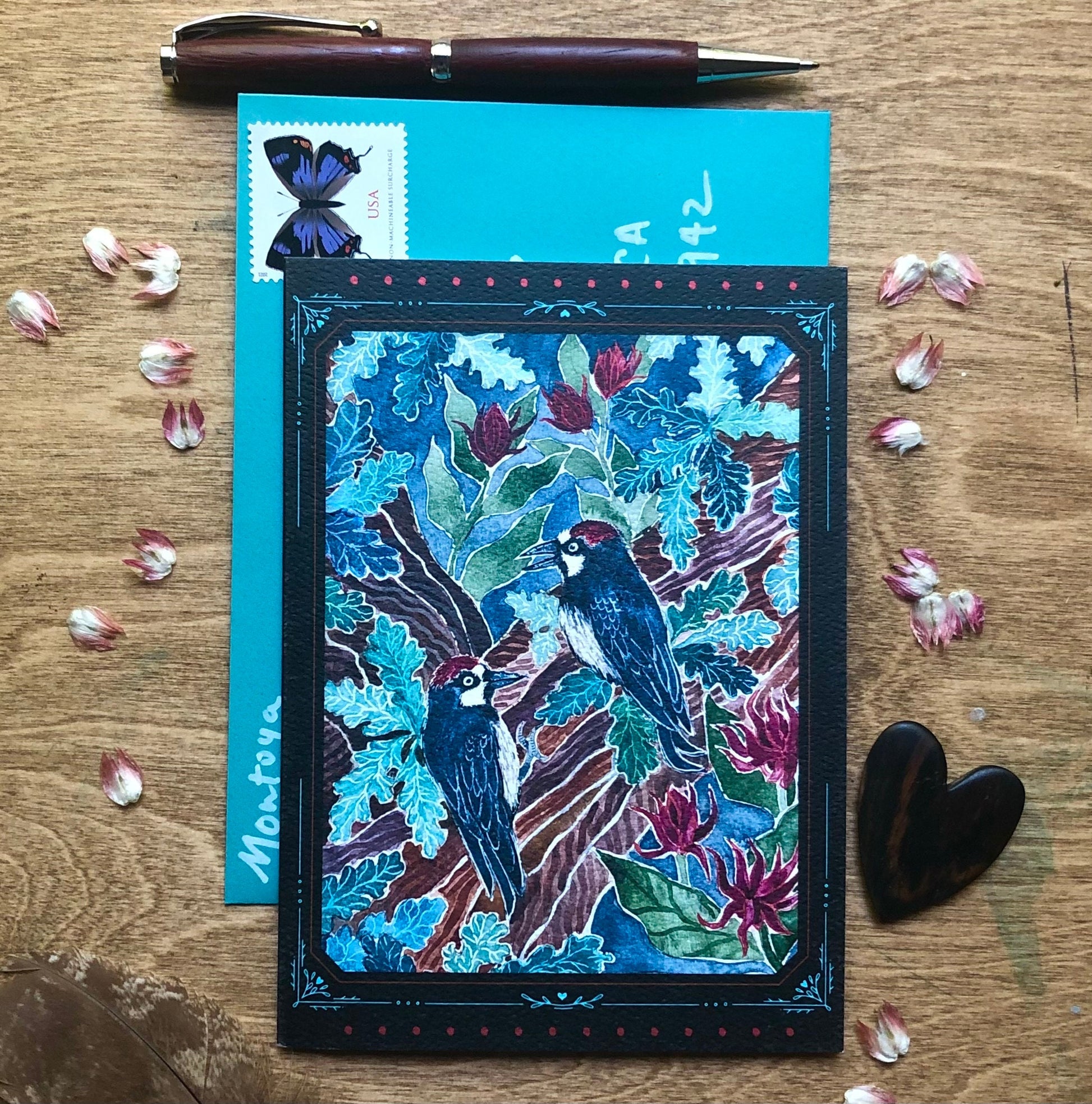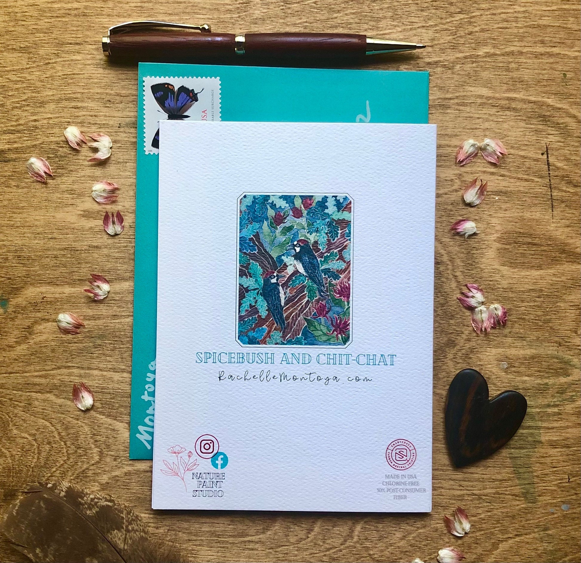 Printed professionally using eco friendly watercolor textured card stock. chlorine-free 30% post consumer fiber. Tropical blue colored envelope included, comes in a protective sleeve. Free shipping on all cards.
