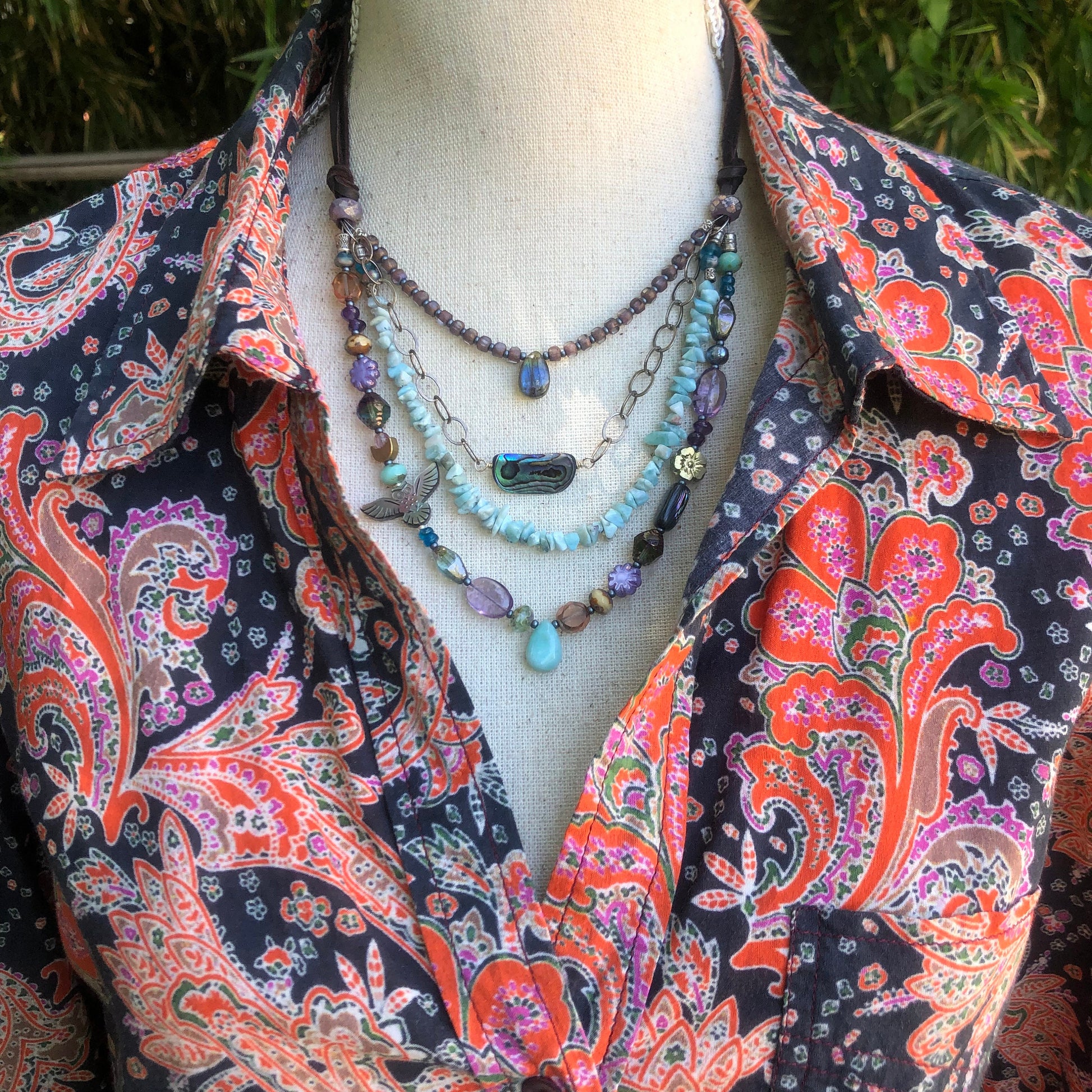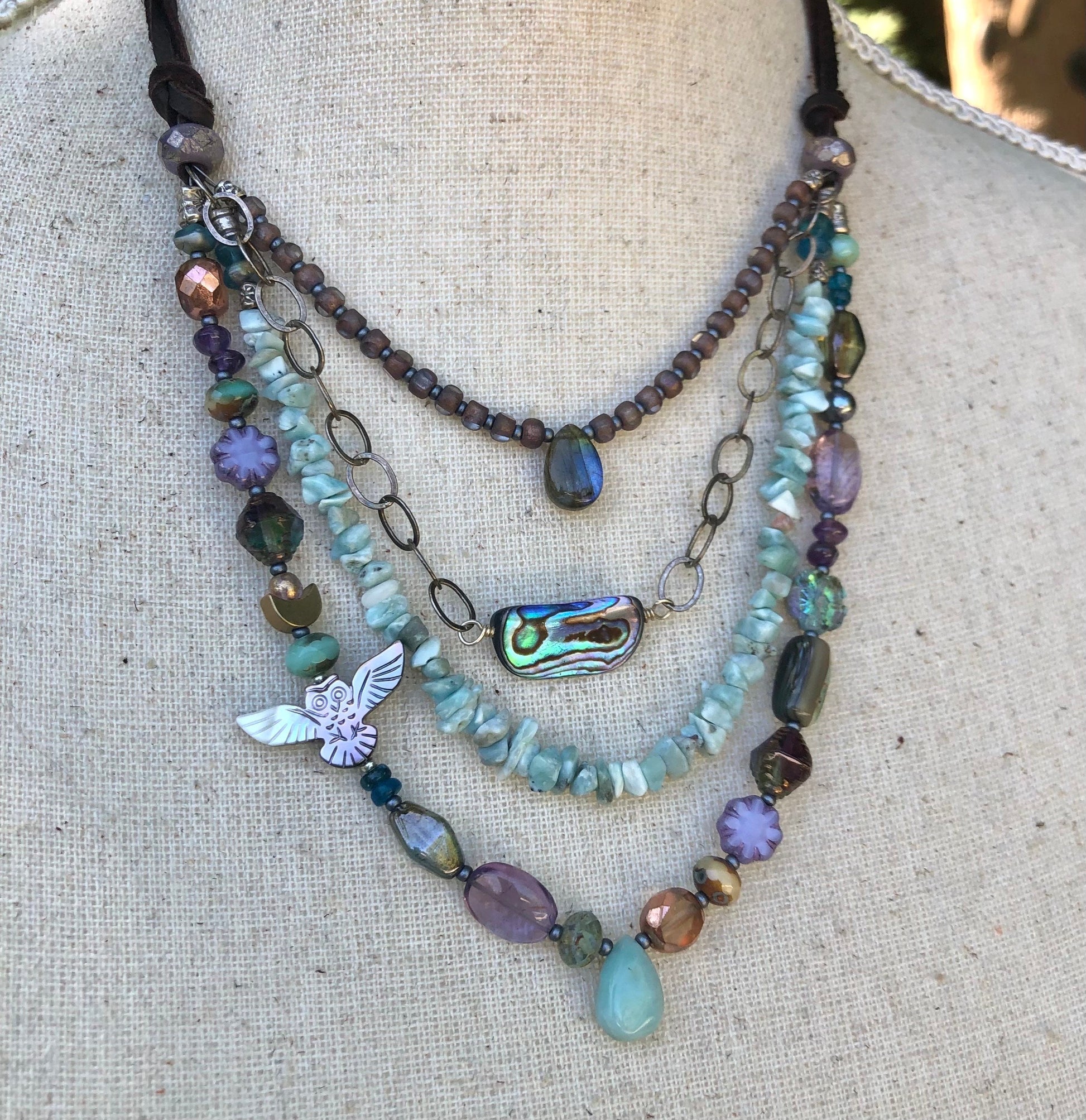 Handmade multi strand beaded necklace with deer skin leather lace has an adjustable czech glass bead slider. There is a sterling silver chain with abalone owl fetish bead, larimar chip beads, larimar and labadorite gemstone teardrops and lots of top quality Czech glass beads. Wear as a choker, or lengthen as long as 32".