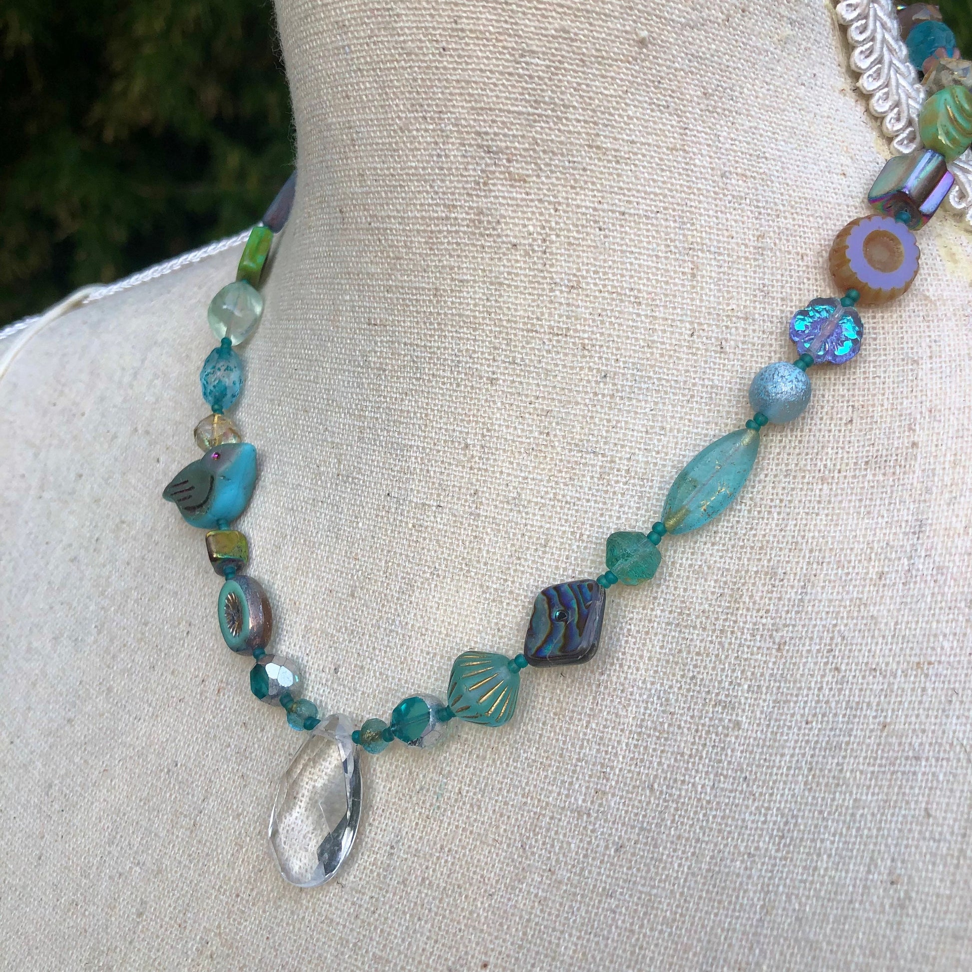 This chunky statement necklace has many assorted artisan quality beads, Czech glass, abalone, Quartz crystal. Features a Czech glass button and leather clasp.
