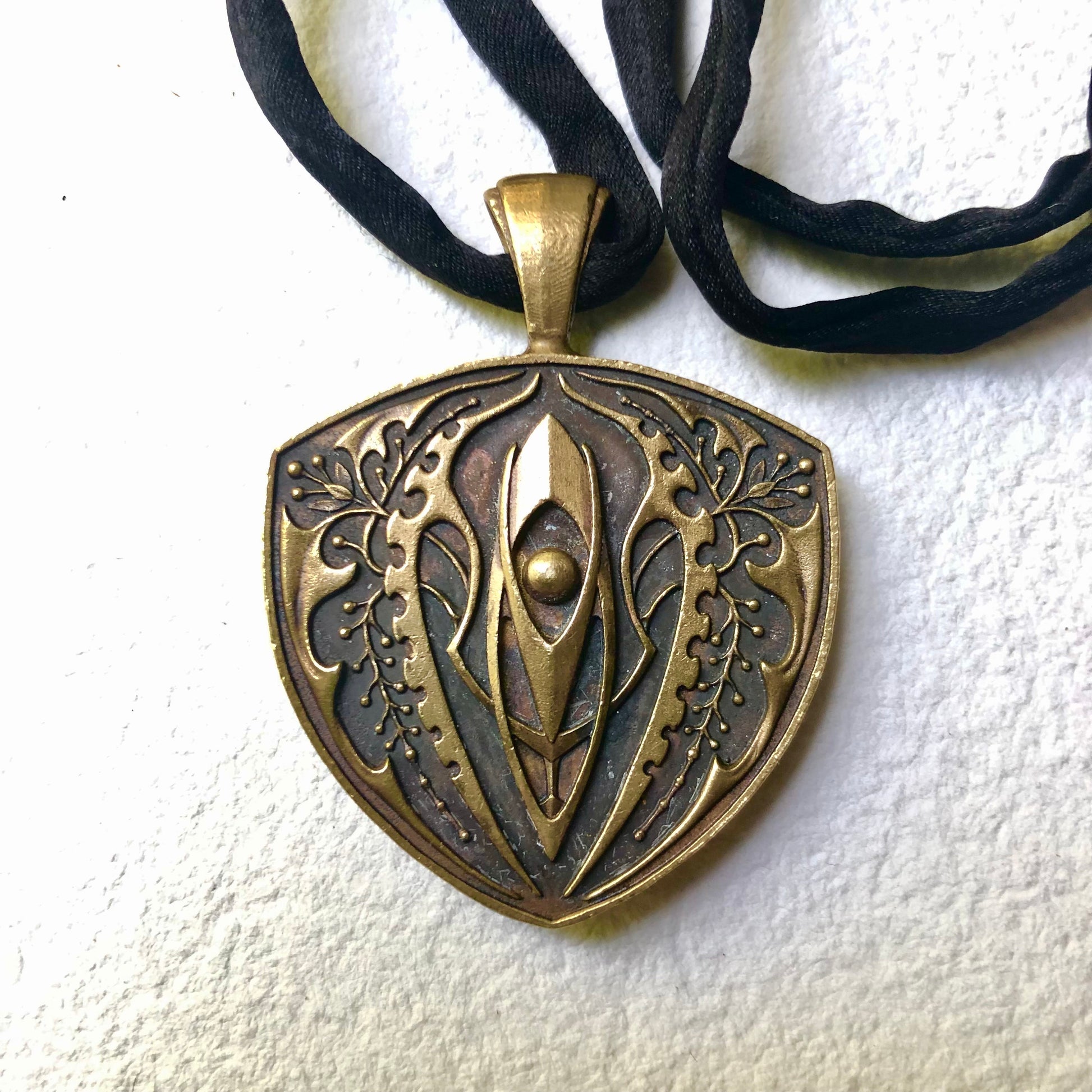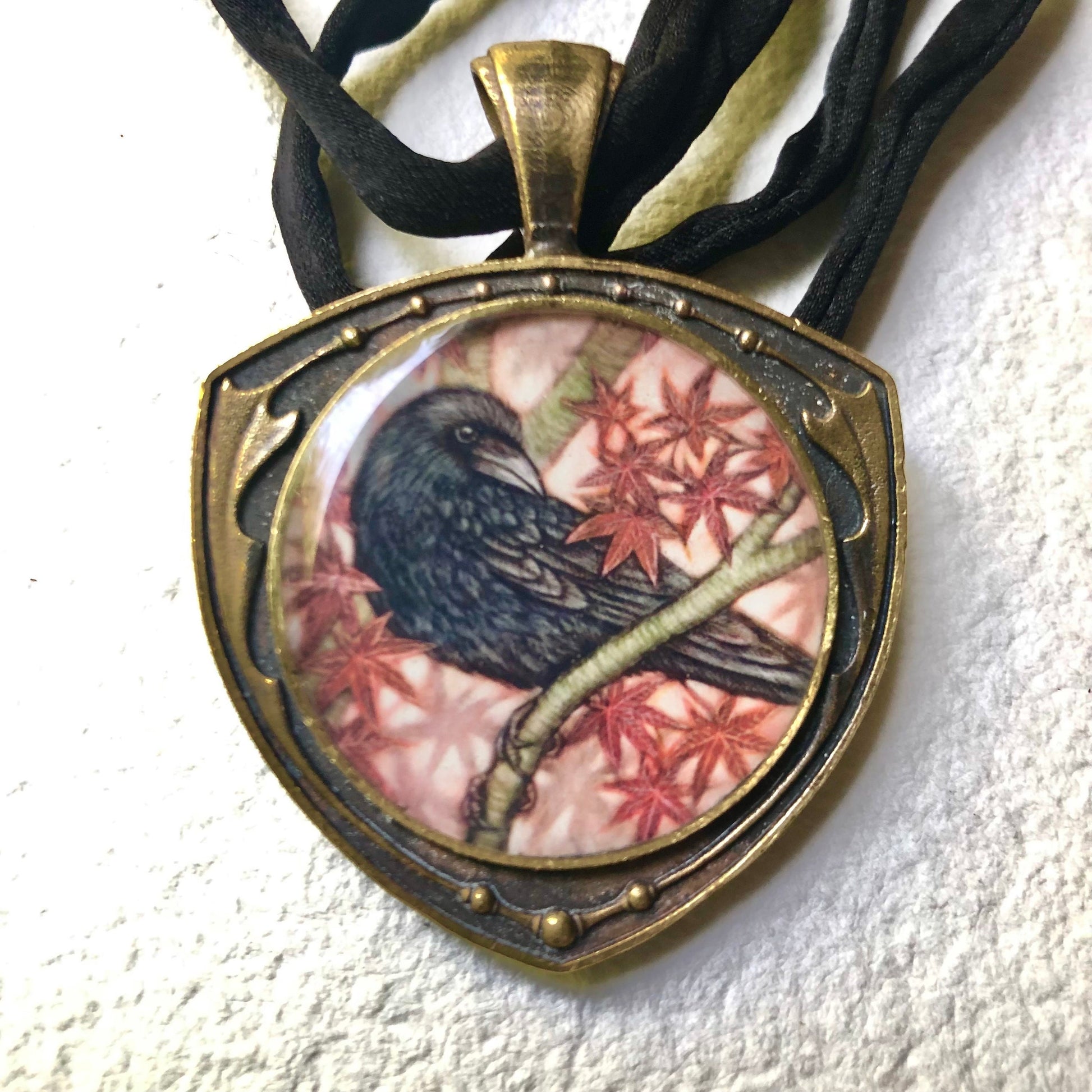 Bezel designed by Kastblanks in Odessa, Ukraine by artist Viktoriia Striuk. Solid bronze, poured in a foundry in Ukraine by Viktoriia's masters. Created with my own original art and protected with hand poured jewelry resin. Lux silk cord with adjustable sliding Czech glass bead. Miniature archival print of my original Crow and Japanese Maple painting, is protected by hand poured artist resin. Artisan crafted bronze cast pendant is double sided, wear both ways!