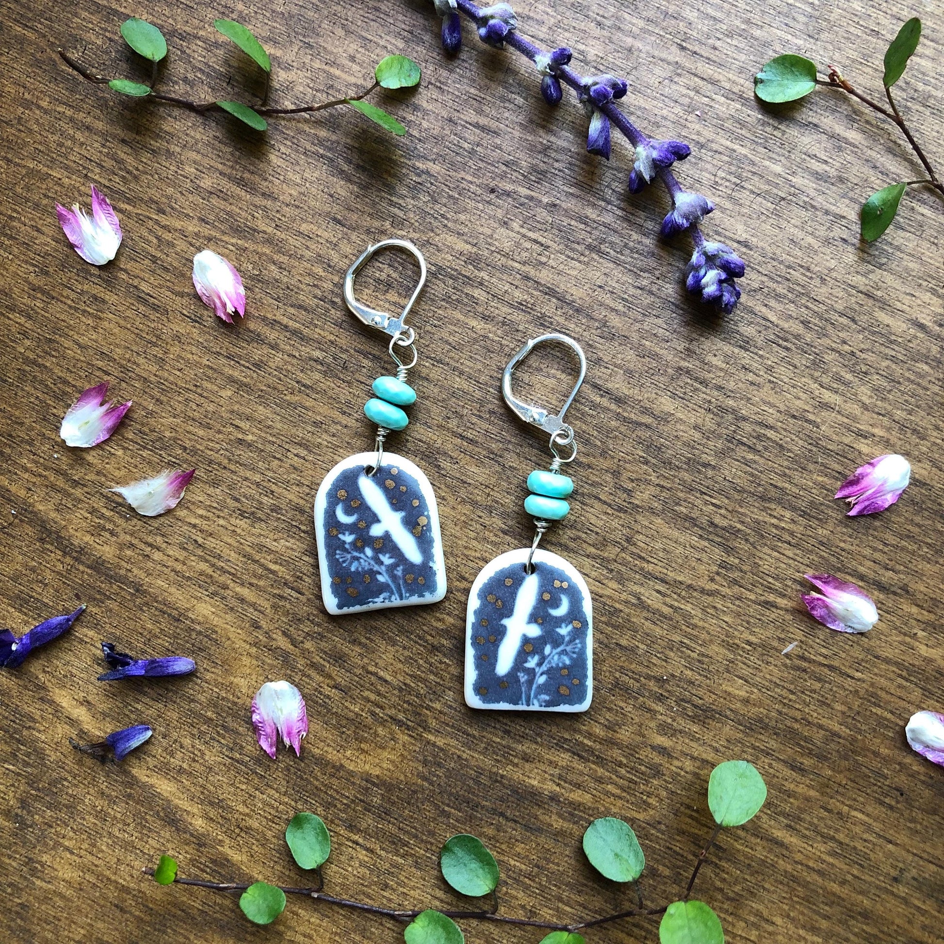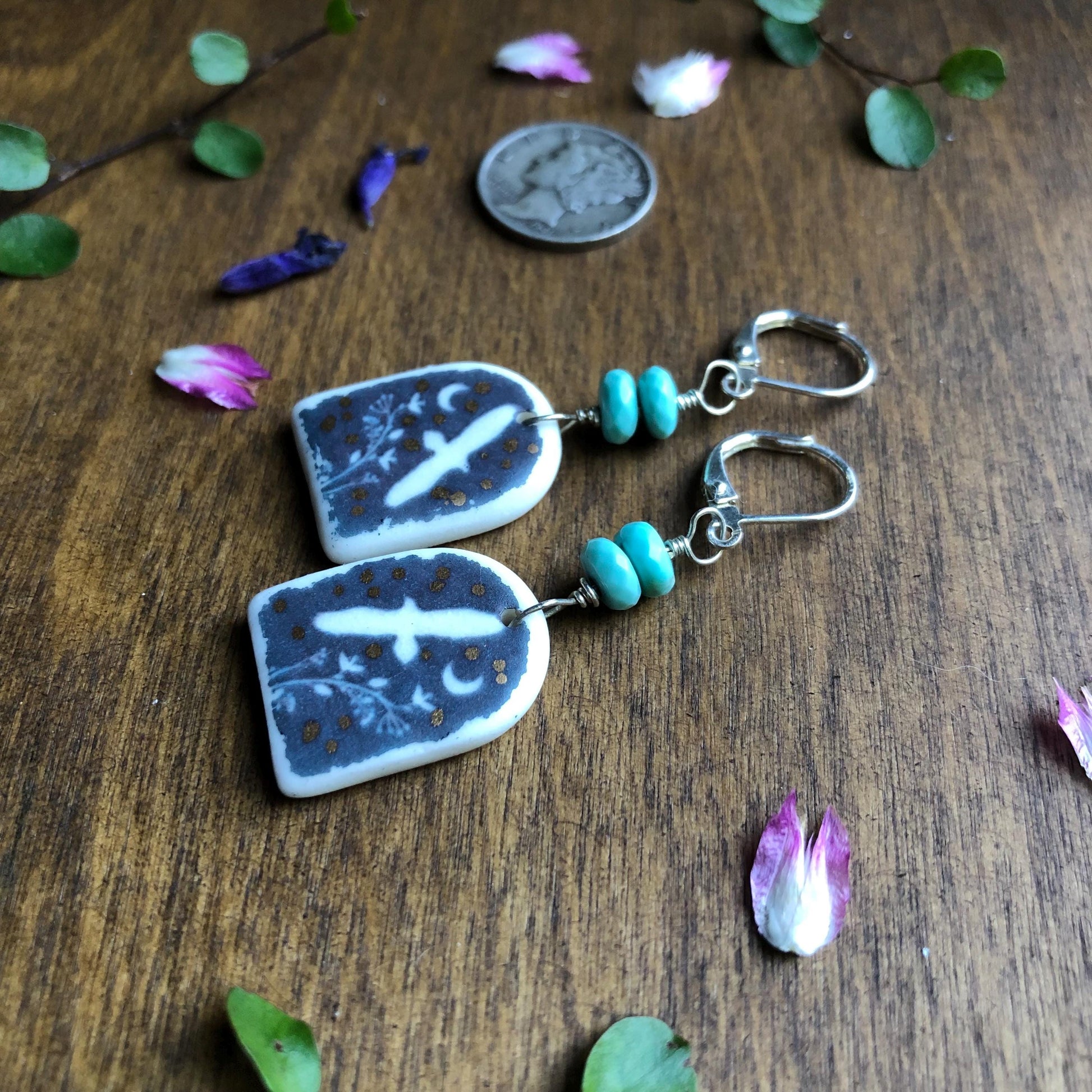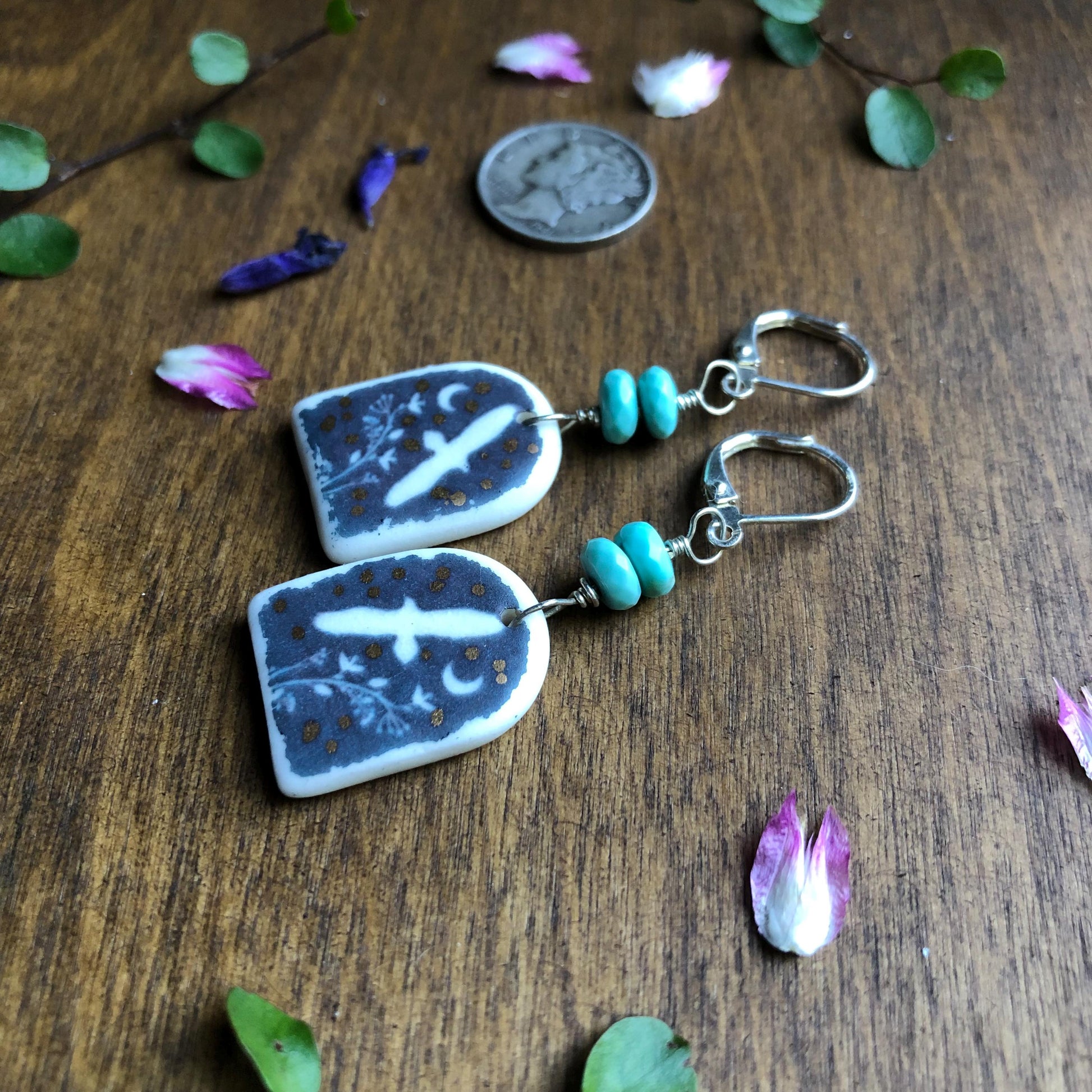 Hawk Earrings with turquoise gemstones. Sterling silver leverbacks. These hawk earrings are made in studio. From creating the porcelain bezels, to applying by hand-the decal of my artwork, each piece is hand painted with little dots of gold luster before the final of three firings.