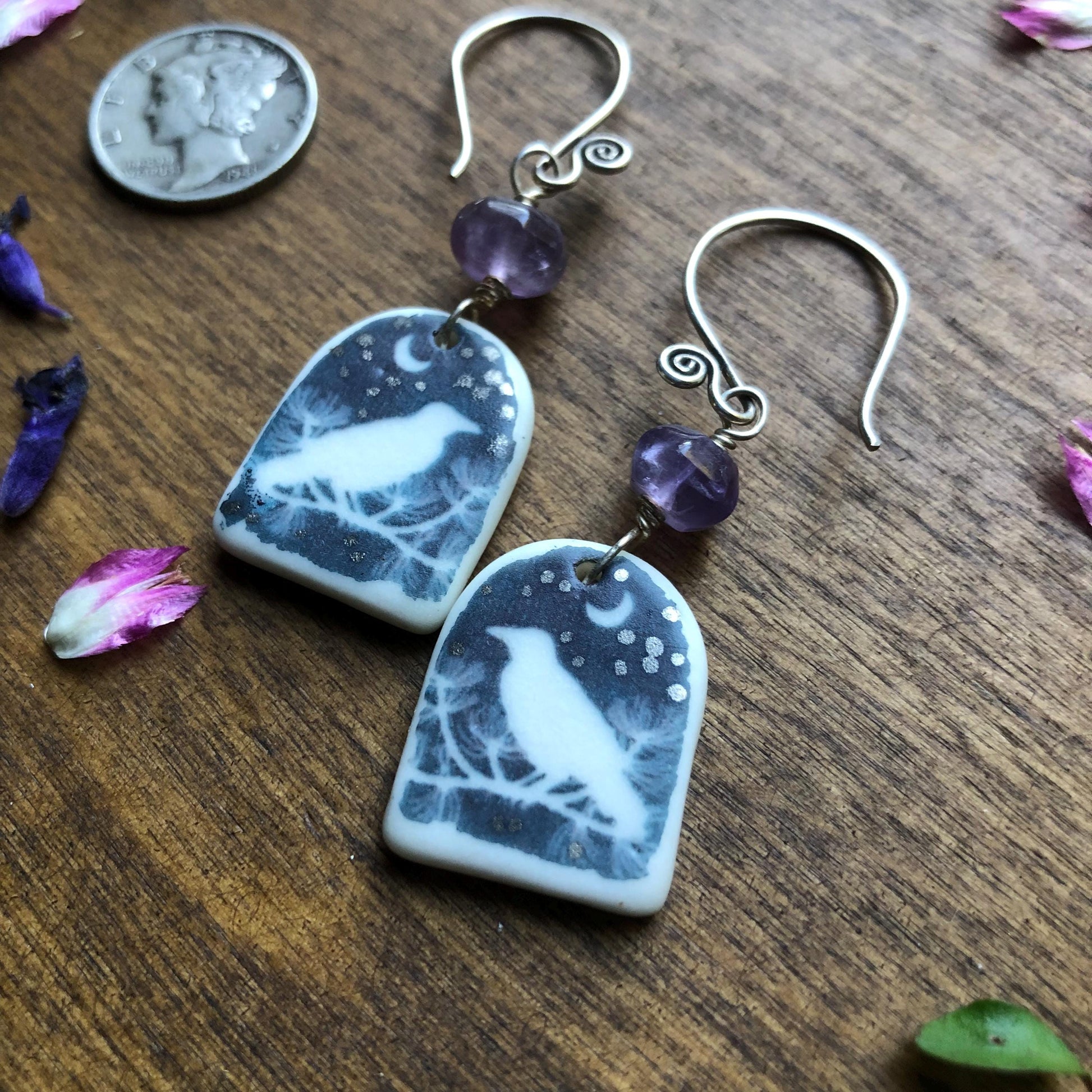Porcelain Raven Earrings with amethyst gemstones and sterling spiral ear wires