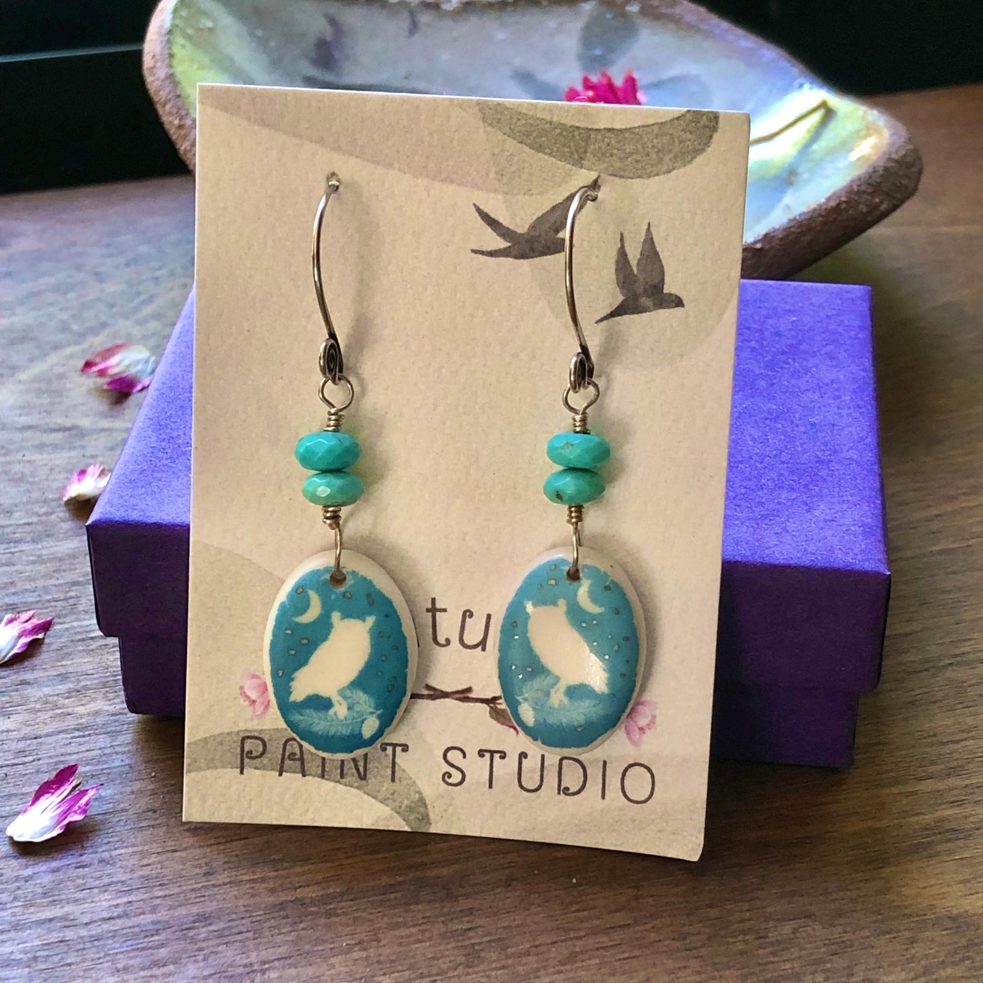 These owl dangle earrings, feature turquoise beads and sterling silver ear wires. Come beautifully wrapped and ready to be gifted.