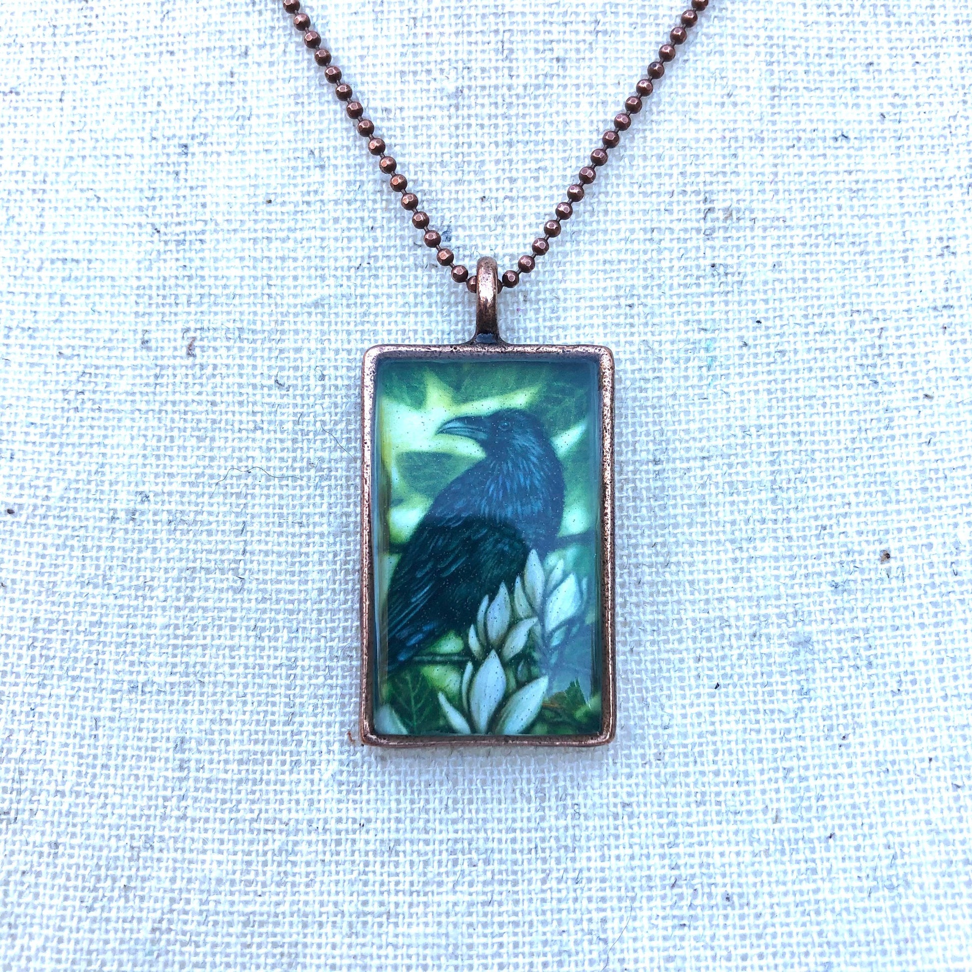 This is a miniature archival print of an original ink painting of mine.This pendant is protected by a glossy jewelry grade resin, with UV inhibitors. Top quality bezel, made of lead free pewter plated in copper, made in the USA. 18" Faceted bead chain necklace with handmade beaded clasp.