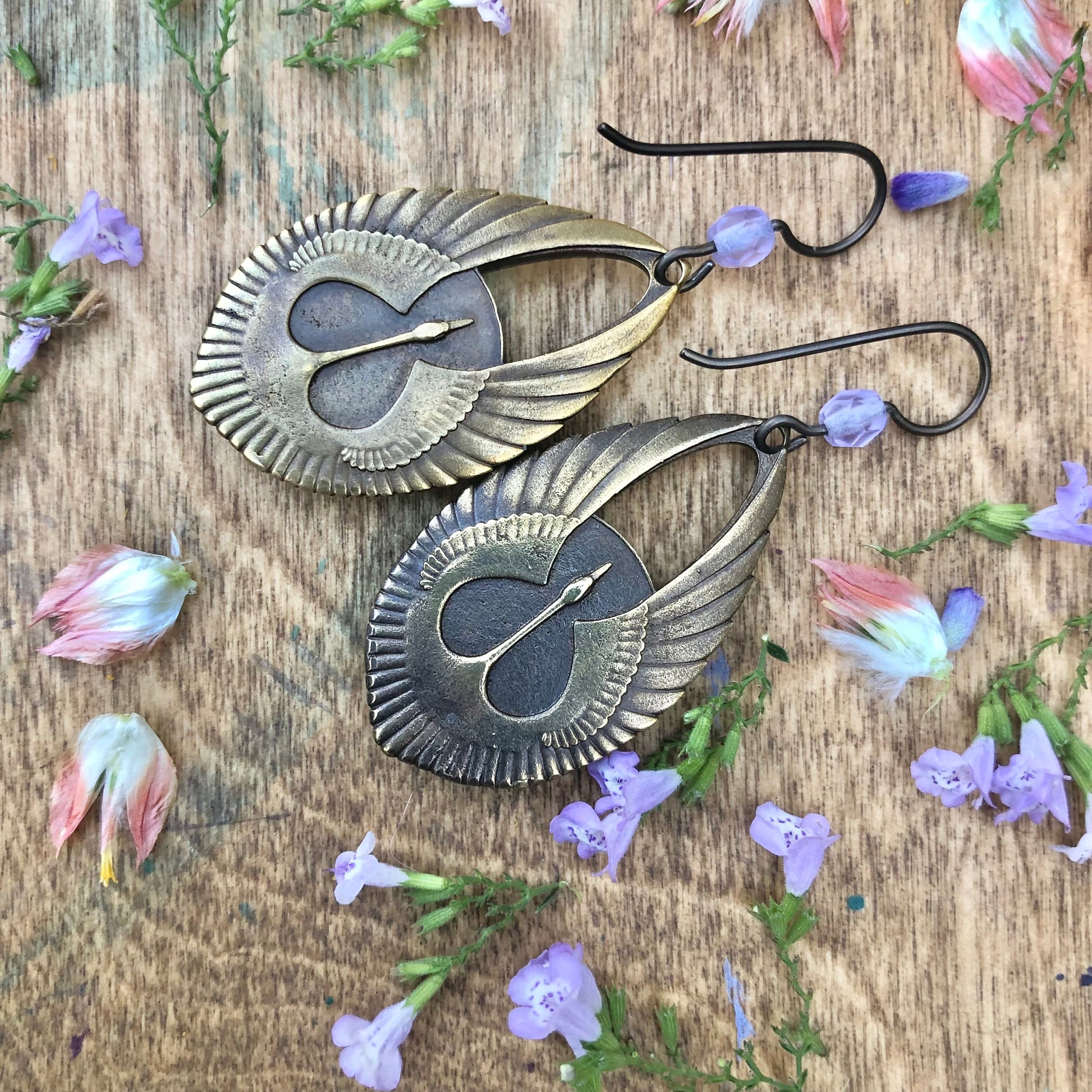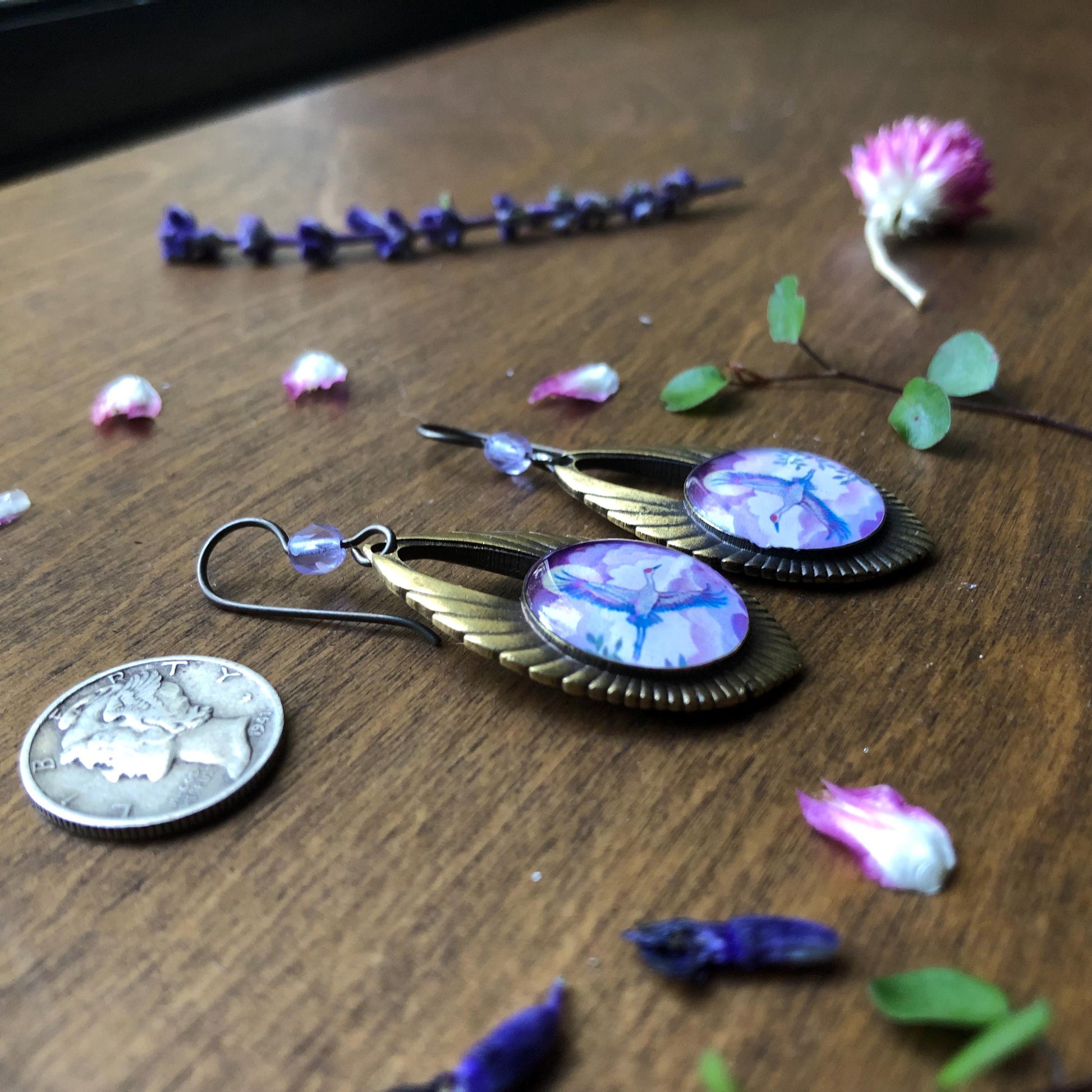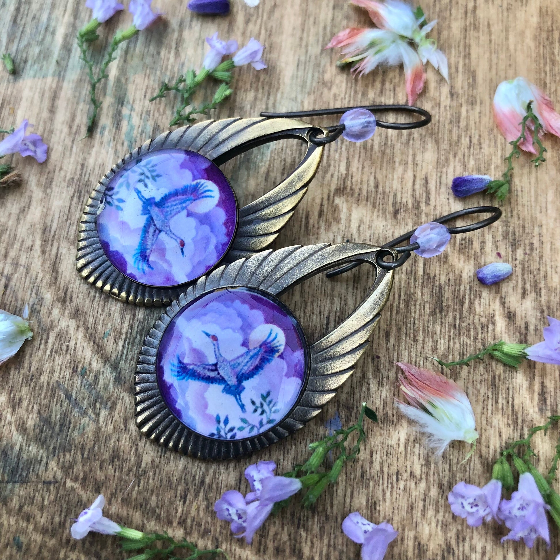 Bezel designed by Kastblanks in Odessa, Ukraine by artist Viktoriia Striuk. Created for my own Sandhill Crane art and protected with hand poured jewelry resin. Tiny archival prints of my original Sandhill Crane art, are protected by hand poured artist resin. Earring bezels are bronze cast, displaying double sided cranes. Hypoallergenic niobium ear wires.