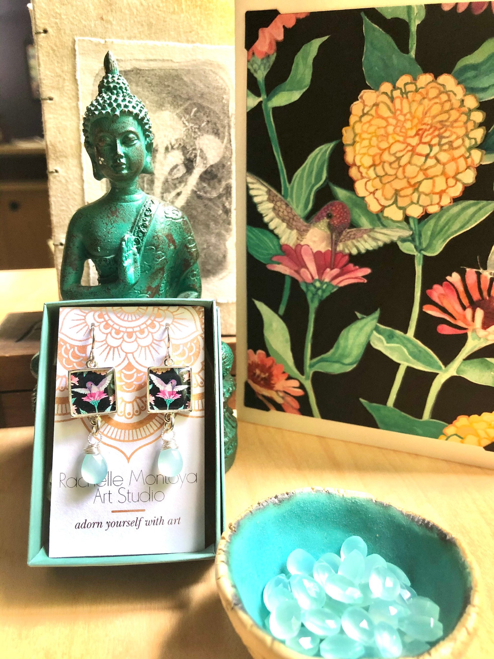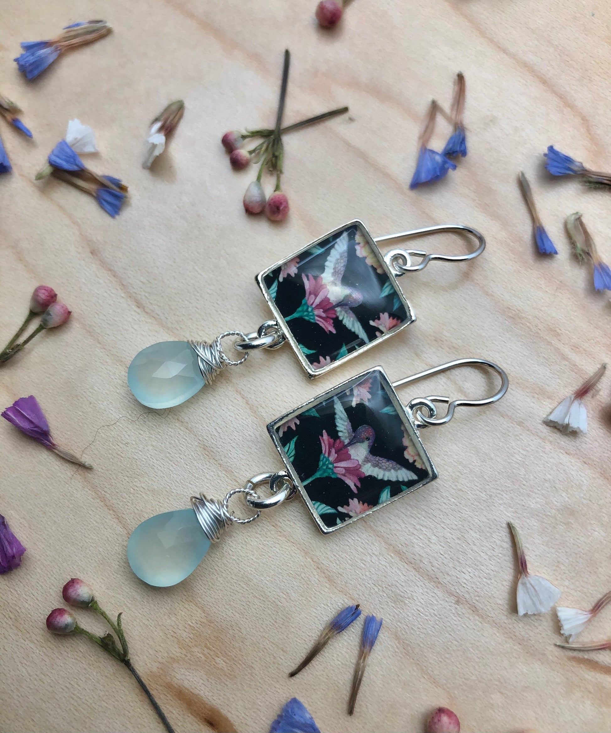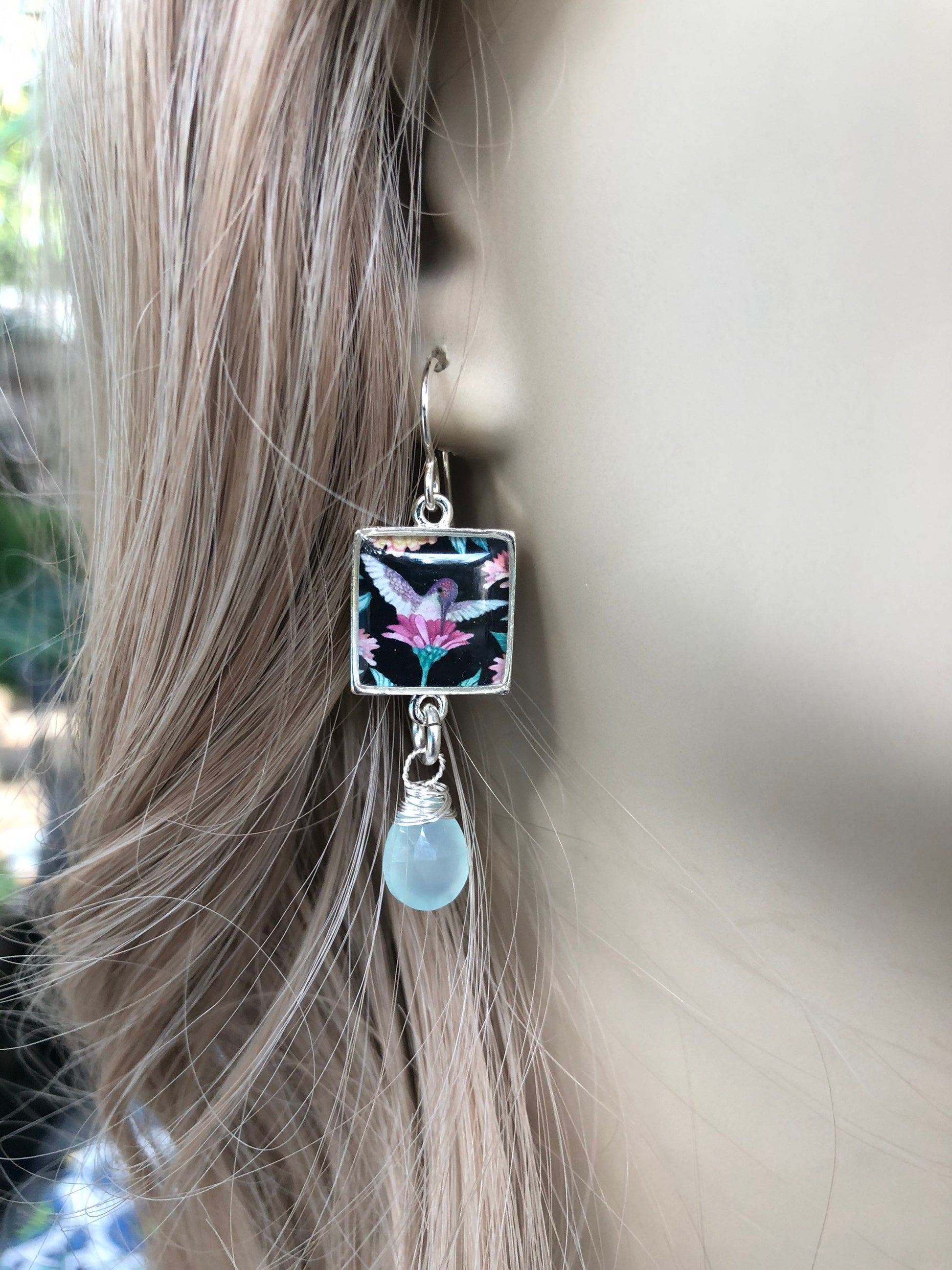These Hummingbirds are miniature archival prints of an original ink painting of mine. Hypo allergenic solid sterling silver ear wires safe for sensitive ears. Earring bezels are 925 Sterling silver plated, pewter cast, nickel and lead free made in the USA. Hand poured jewelry resin, protects artwork and adds luster and shine.